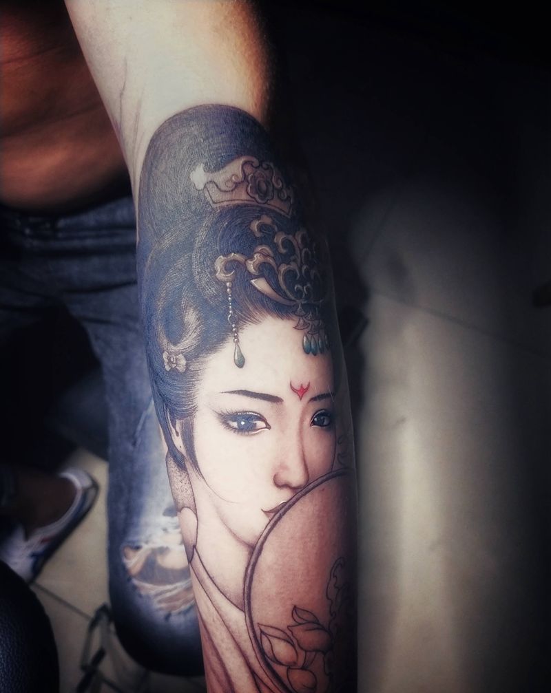 当前位置: 首页 >山东省临沂市纹身店-煌龙刺青纹身图案>人物古风纹身图片_手臂新传统纹身图案