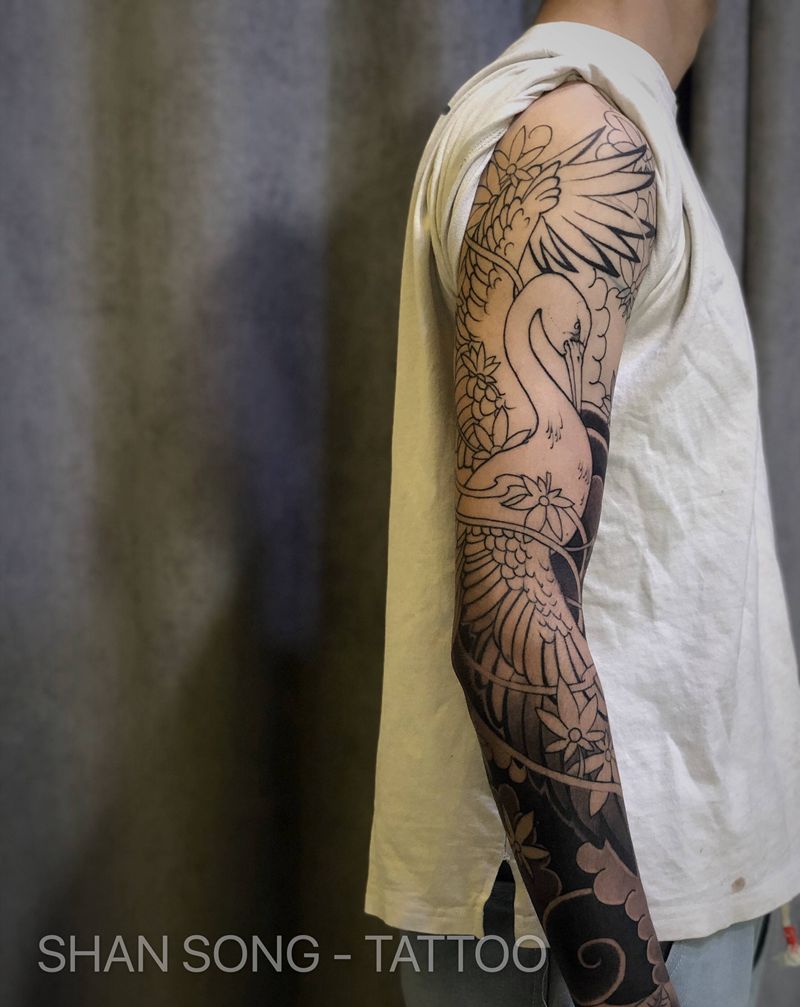 日式花臂纹身图片_手部手臂老传统仙鹤纹身图案