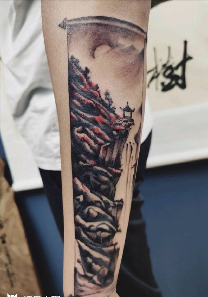 当前位置: 首页 >山东省临沂市纹身店-墨金刺青纹身图案>山水画轴纹身图片_手臂水墨纹身图案