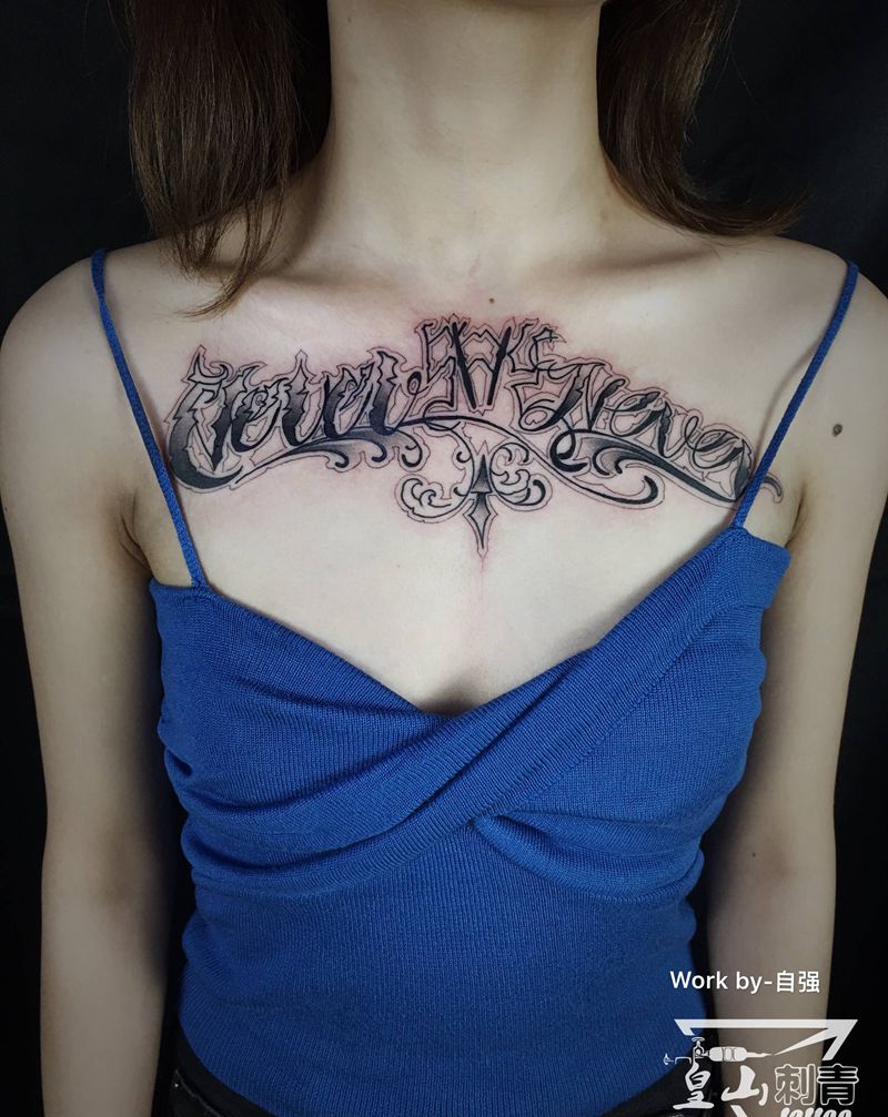 奇卡诺花体英文花胸纹身图片_胸部花体字纹身图案