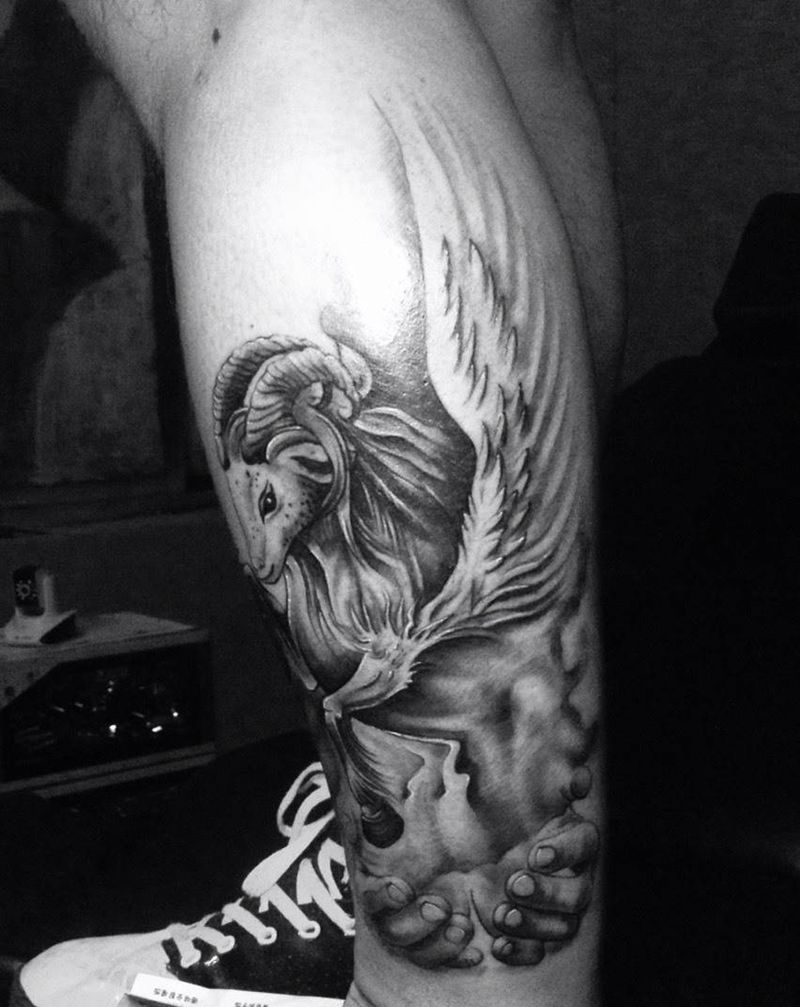 当前位置: 首页 >山东省临沂市纹身店-郯子湖小区纹身图案>羊头马身纹身图片_成品腿部传统国画原创动物鬼神纹身图案