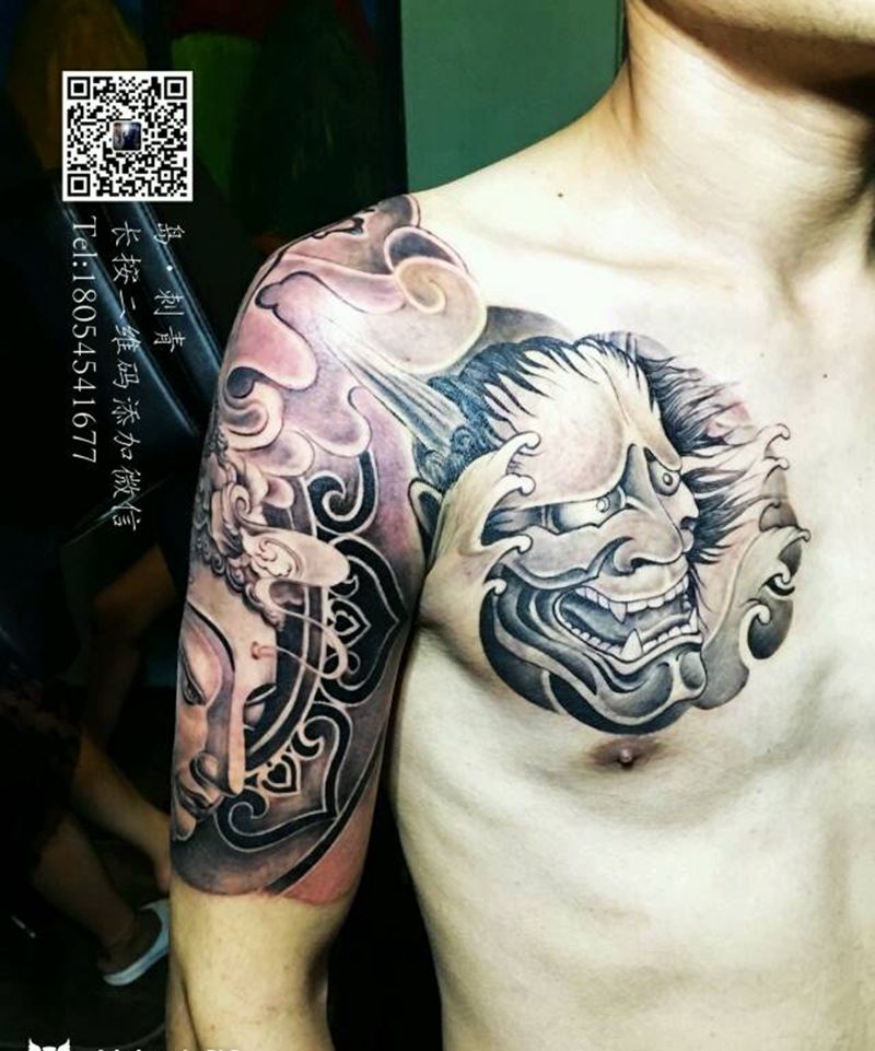 半甲纹身图片_胸部传统写实鬼神图腾宗教成品纹身图案