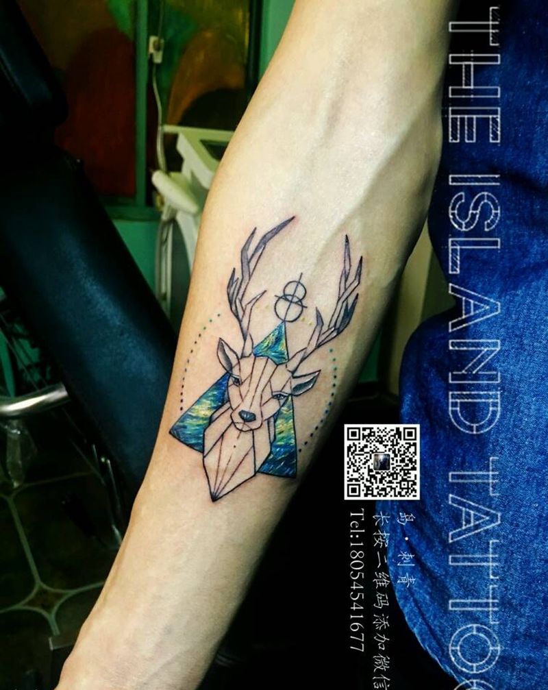当前位置: 首页 >山东省临沂市纹身店-郯子湖小区纹身图案>小臂鹿头纹身图片_手臂传统写实动物植物成品手稿纹身图案