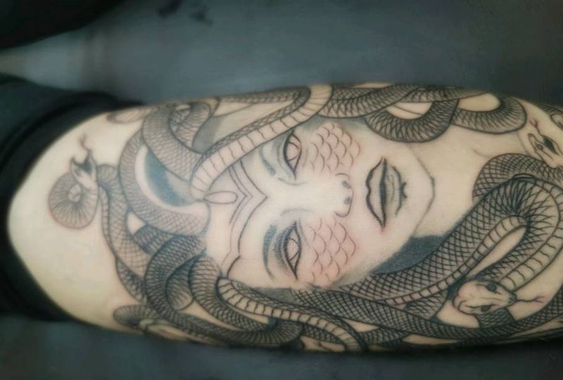 当前位置: 首页 >山东省聊城市纹身店-皇朝刺青旗舰店纹身图案>修改一只美杜莎纹身图片_腿部New School纹身图案