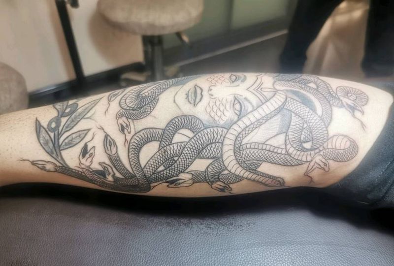 当前位置: 首页 >山东省聊城市纹身店-皇朝刺青旗舰店纹身图案>修改一只美杜莎纹身图片_腿部New School纹身图案