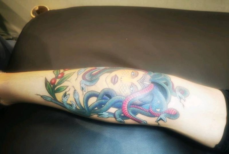 当前位置: 首页 >山东省聊城市纹身店-皇朝刺青旗舰店纹身图案>修改一只美杜莎纹身图片_腿部New School纹身图案