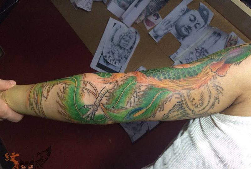 当前位置: 首页 >山东省聊城市纹身店-皇朝刺青旗舰店纹身图案>彩色传统凤凰花臂纹身图片_手臂成品传统烈火风格动物宗教鬼神纹身图案