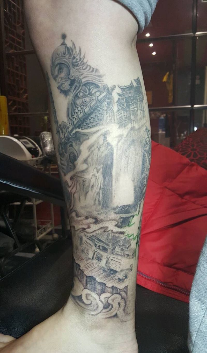当前位置: 首页 >山东省聊城市纹身店-皇朝刺青旗舰店纹身图案>花腿纹身图片_腿部传统写实人物鬼神聊城烈火风格成品纹身图案