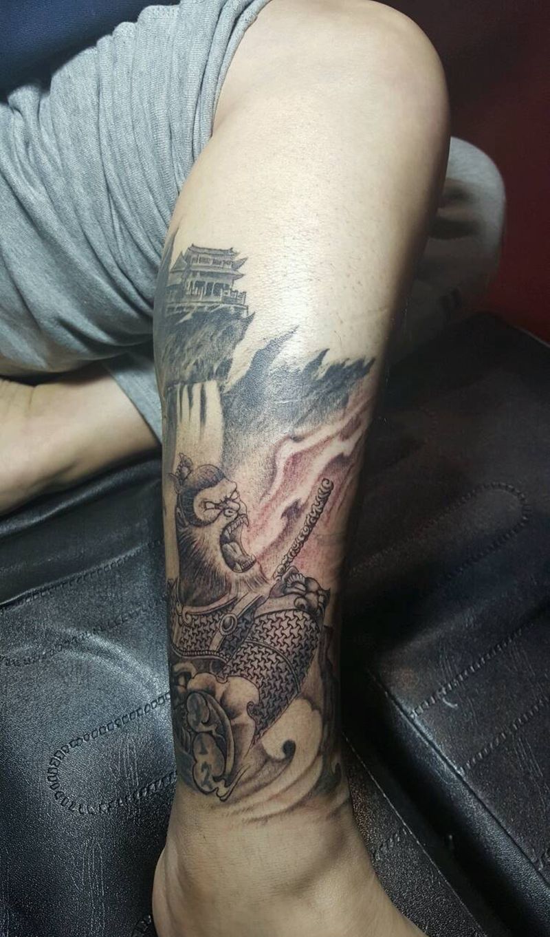 当前位置: 首页 >山东省聊城市纹身店-皇朝刺青旗舰店纹身图案>花腿纹身图片_腿部传统写实人物鬼神聊城烈火风格成品纹身图案