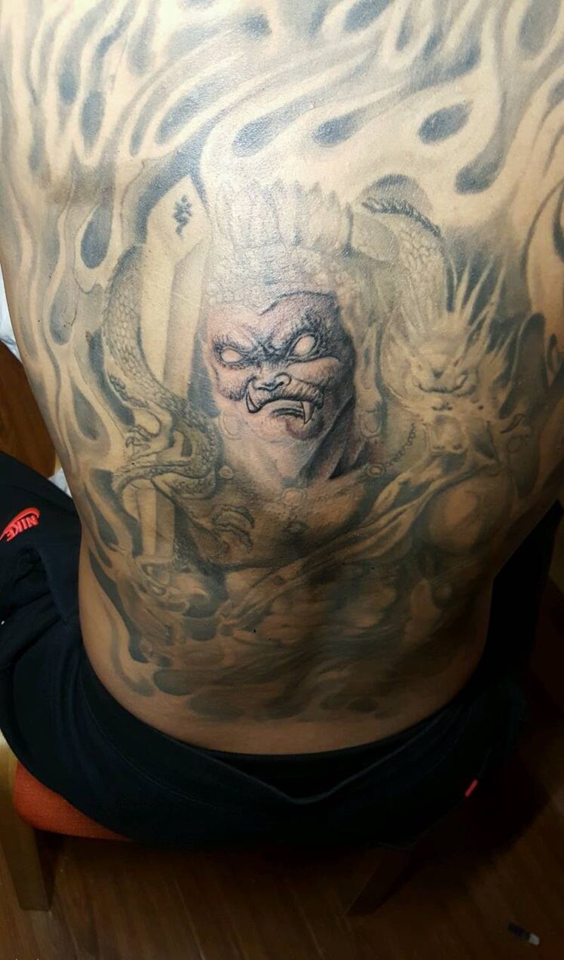 当前位置: 首页 >山东省聊城市纹身店-皇朝刺青旗舰店纹身图案>大背纹身图片_背部传统人物鬼神宗教烈火风格成品纹身图案
