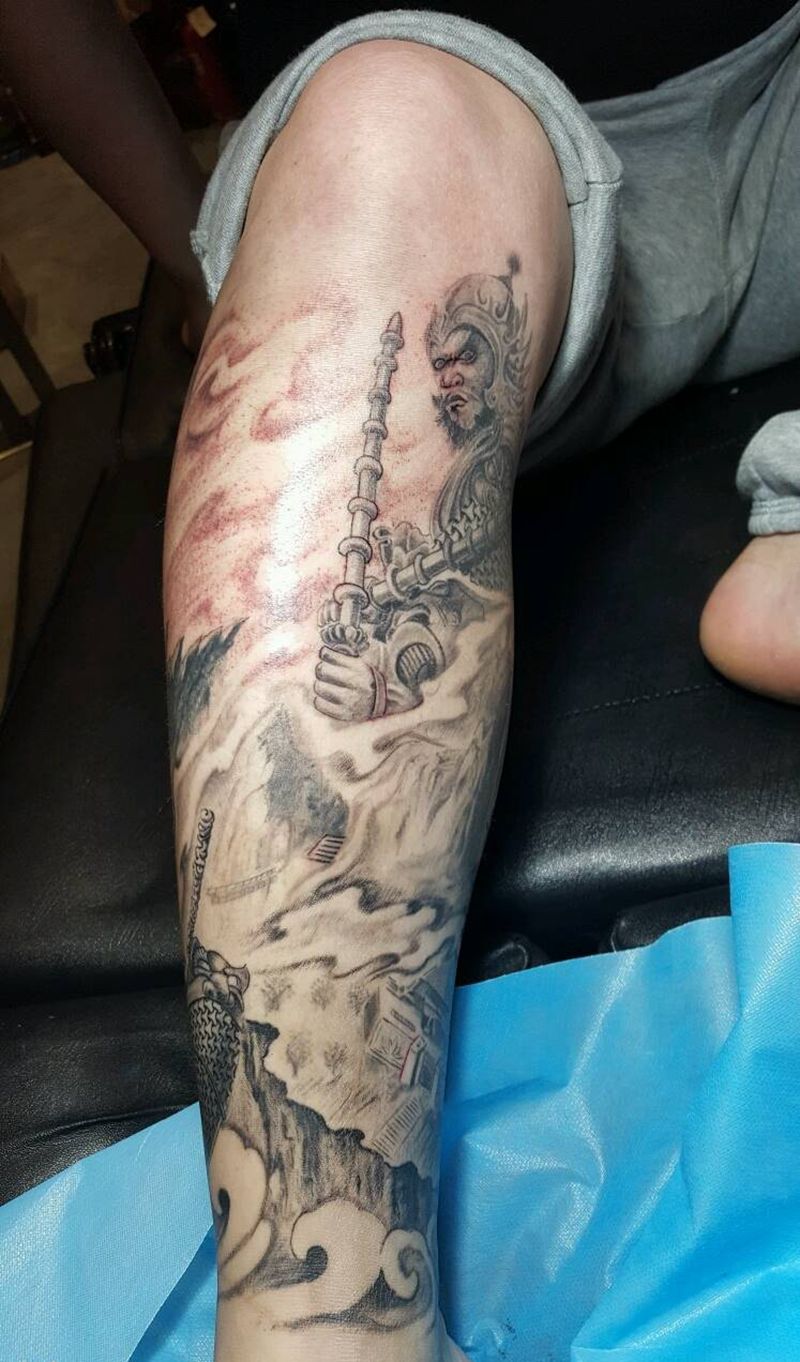 当前位置: 首页 >山东省聊城市纹身店-皇朝刺青旗舰店纹身图案>烈火风格包小腿纹身图片_腿部传统人物植物聊城烈火风格烈火堂成品纹身图案