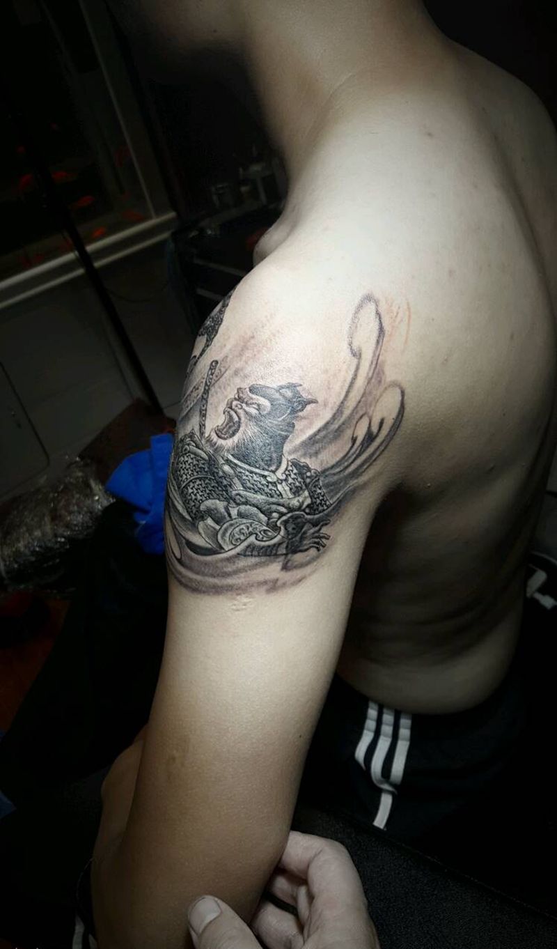 当前位置: 首页 >山东省聊城市纹身店-皇朝刺青旗舰店纹身图案>覆盖作品纹身图片_手臂传统写实鬼神宗教原创烈火风格烈火堂成品纹身图案