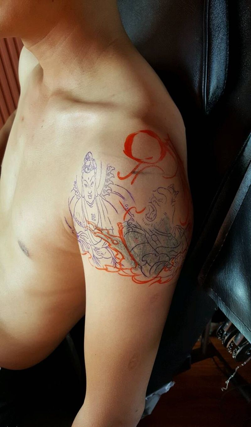 当前位置: 首页 >山东省聊城市纹身店-皇朝刺青旗舰店纹身图案>覆盖作品纹身图片_手臂传统写实鬼神宗教原创烈火风格烈火堂成品纹身图案