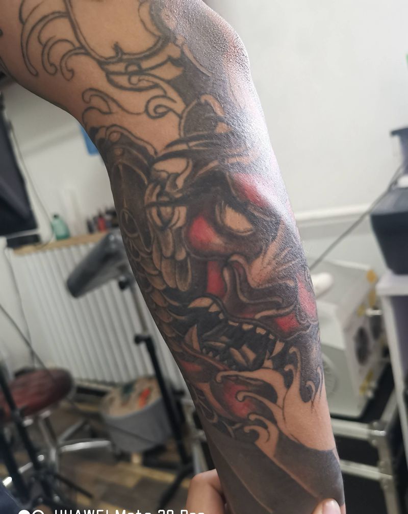 • T网红王老大花腿龙纹身图片_腿部新传统纹身图案