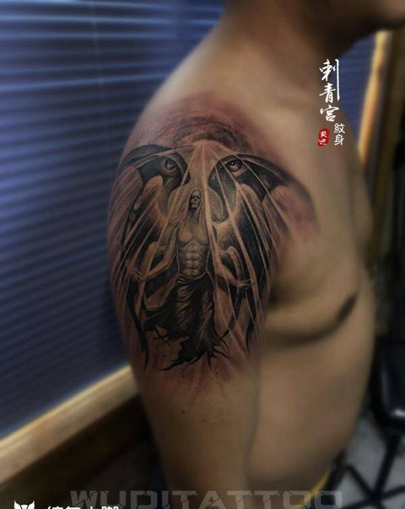 六翼天使 未完纹身图片_肩部欧美写实鬼神纹身图案