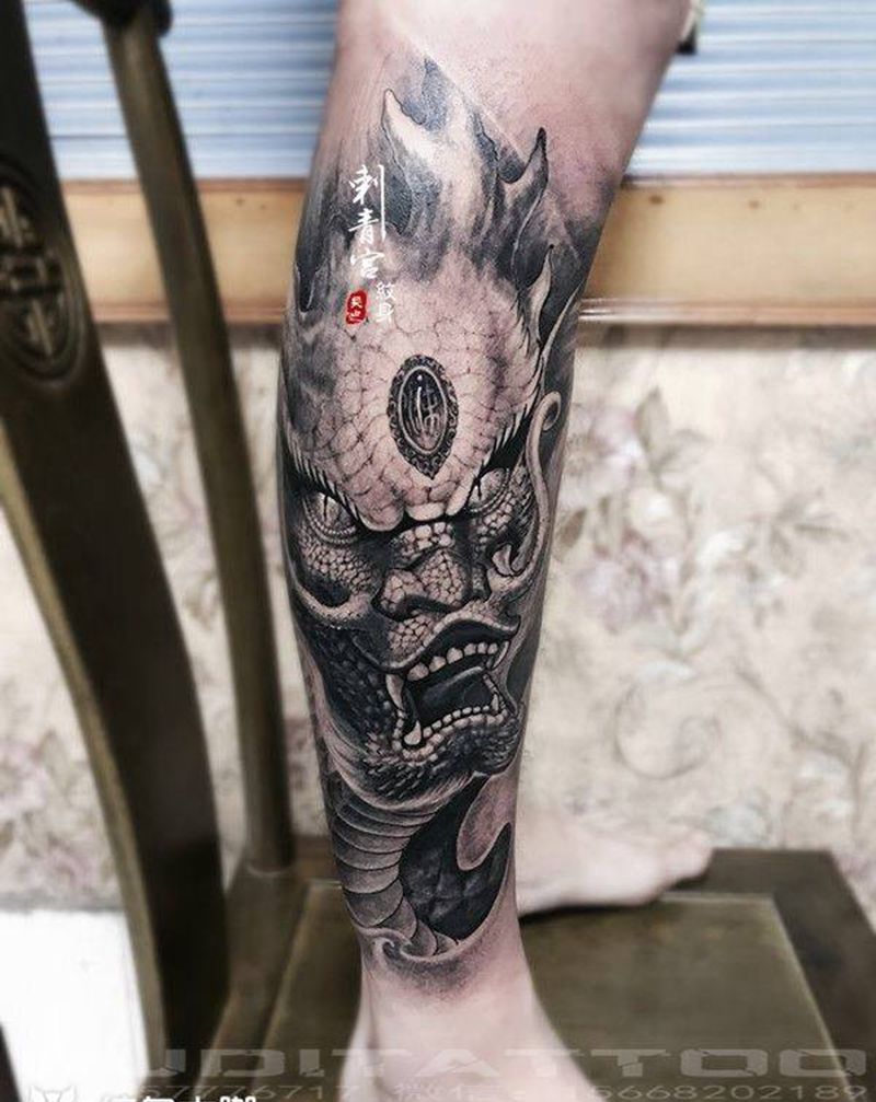 • T网红王老大花腿龙纹身图片_腿部新传统纹身图案