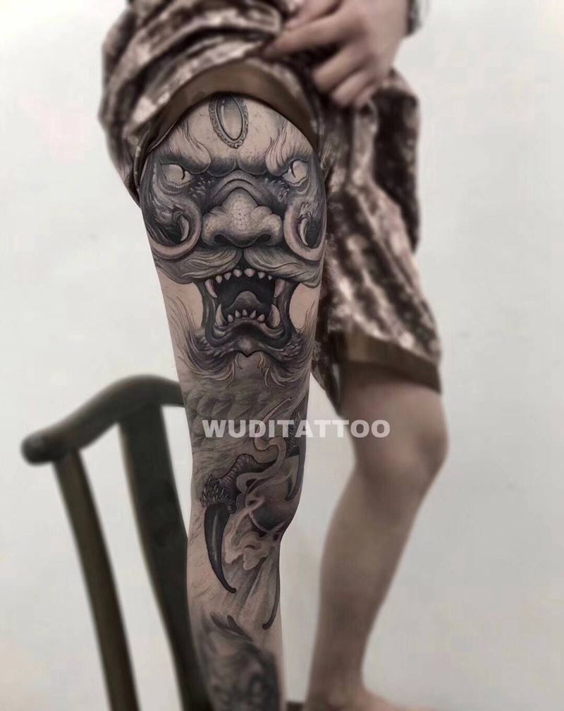 • T网红王老大花腿龙纹身图片_腿部新传统纹身图案