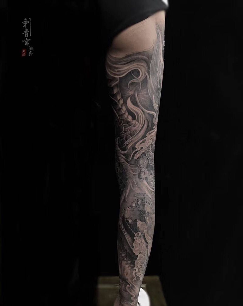 • T网红王老大花腿龙纹身图片_腿部新传统纹身图案