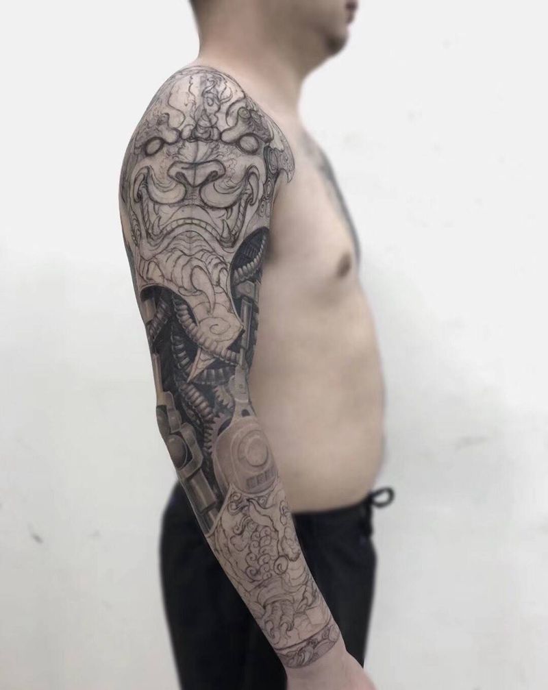 富贵双狮机械臂纹身图片