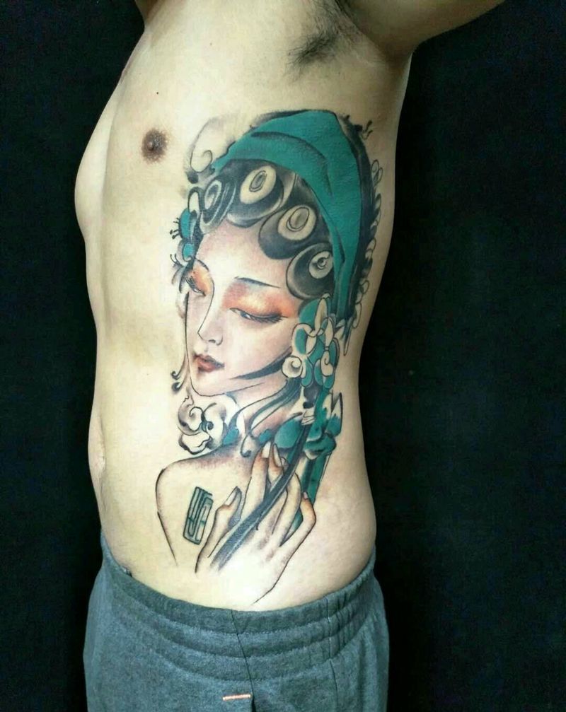 当前位置: 首页 >山东省德州市纹身店-君刺青纹身图案>青衣纹身图片_腹部传统肖像人物成品纹身图案