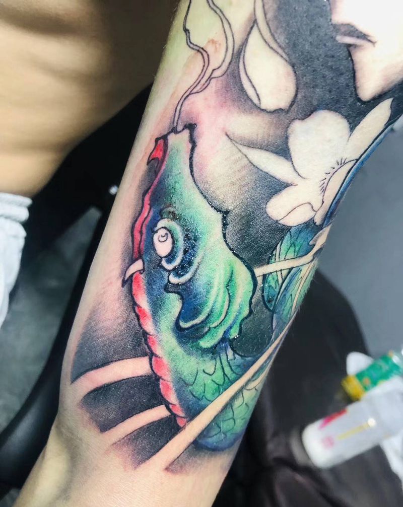当前位置: 首页 >山东省聊城市纹身店-九度刺青纹身图案>青蛇侍女图纹身图片_手臂新传统纹身图案