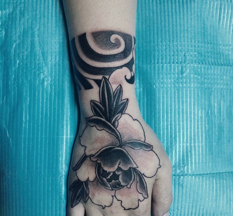 牡丹花纹身图片_手部老传统纹身图案