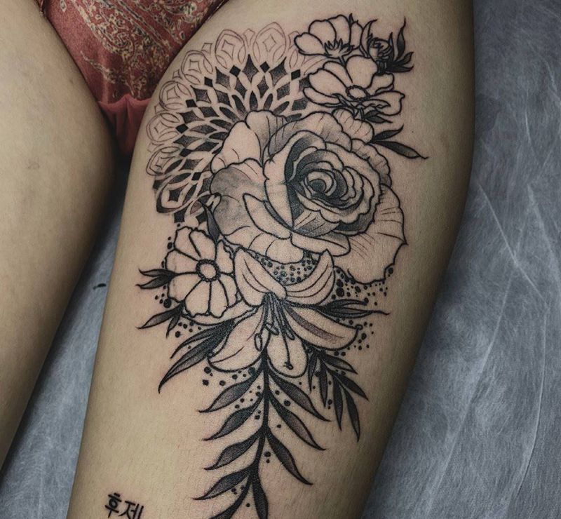 素花纹身图片_腿部点刺纹身图案