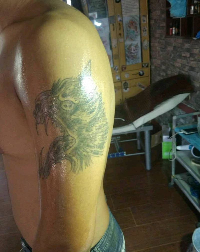 当前位置: 首页 >山东省菏泽市纹身店-菏泽墨舞刺青工作室纹身图案>鲤鱼遮盖狼头纹身图片