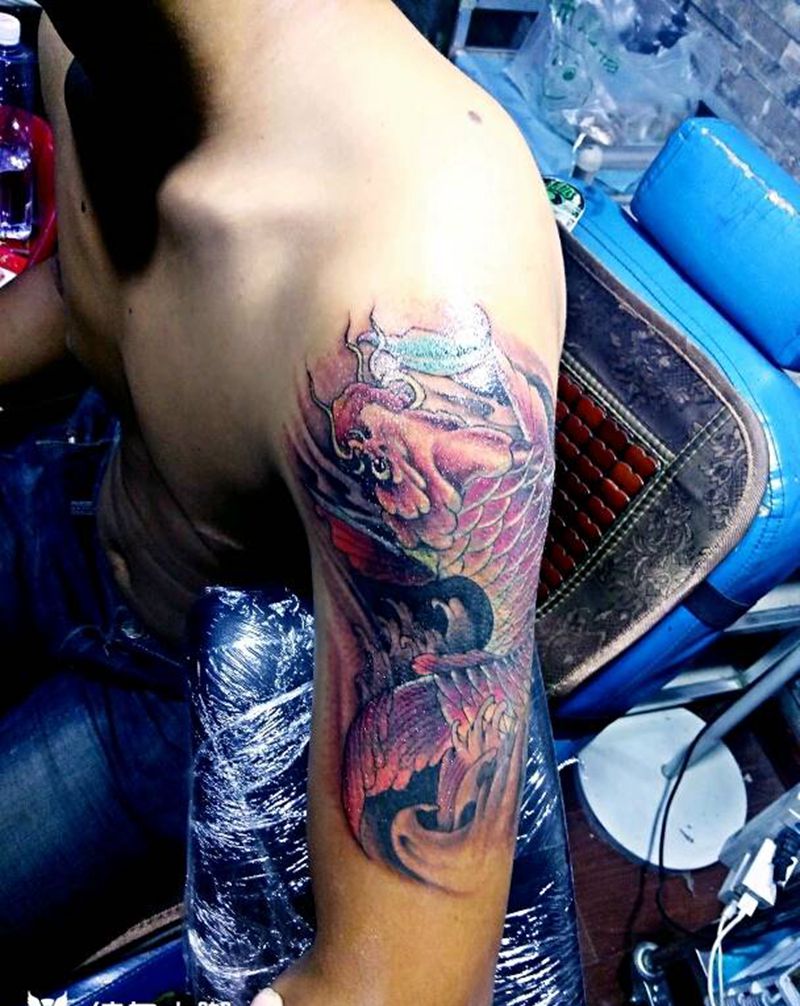当前位置: 首页 >山东省菏泽市纹身店-菏泽墨舞刺青工作室纹身图案>鲤鱼遮盖狼头纹身图片