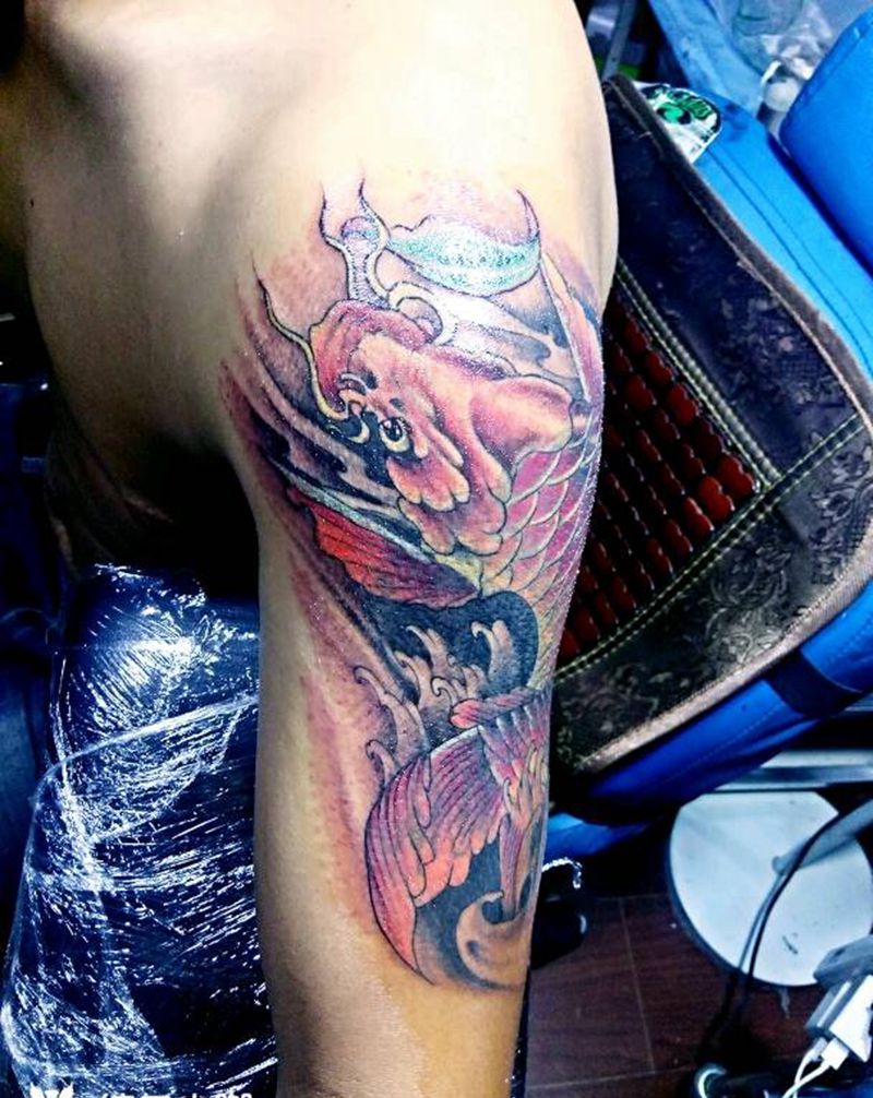 当前位置: 首页 >山东省菏泽市纹身店-菏泽墨舞刺青工作室纹身图案>鲤鱼遮盖狼头纹身图片