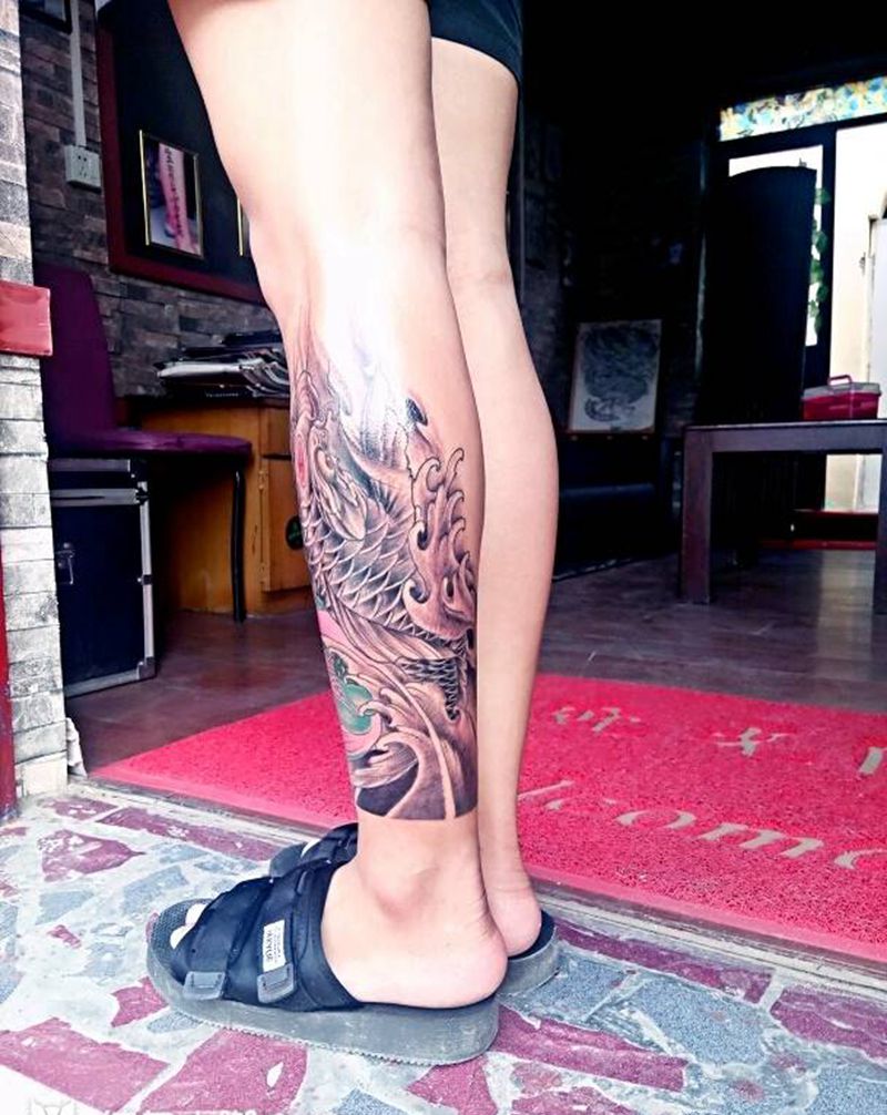 • T网红王老大花腿龙纹身图片_腿部新传统纹身图案
