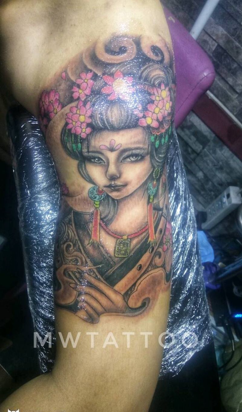 当前位置: 首页 >山东省菏泽市纹身店-菏泽墨舞刺青工作室纹身图案>艺妓纹身图片_肩部手臂传统贴纸人物鬼神成品纹身图案