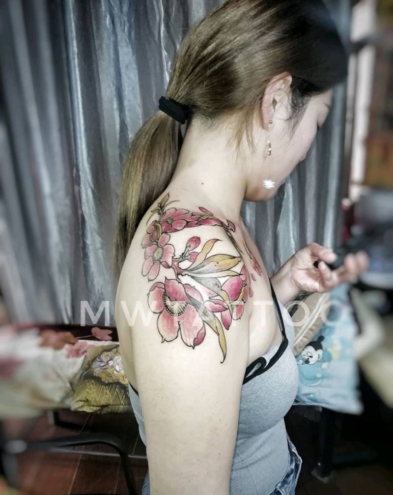 当前位置: 首页 >山东省菏泽市纹身店-菏泽墨舞刺青工作室纹身图案>樱花纹身图片_胸部肩部New School新传统纹身图案
