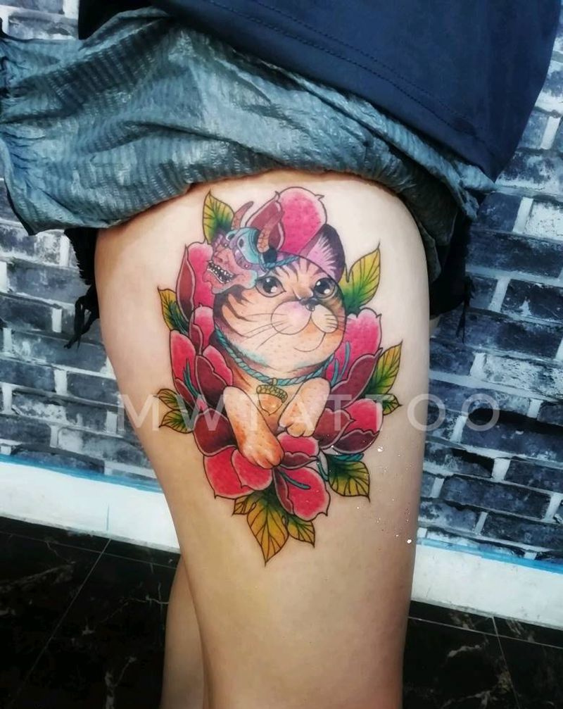 招财猫纹身图片_腿部臀部Old SchoolNew School纹身图案