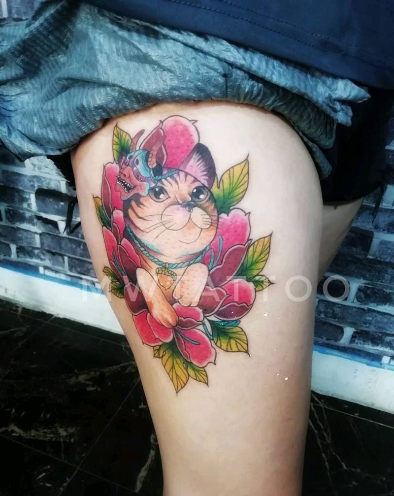 招财猫纹身图片_腿部臀部Old SchoolNew School纹身图案