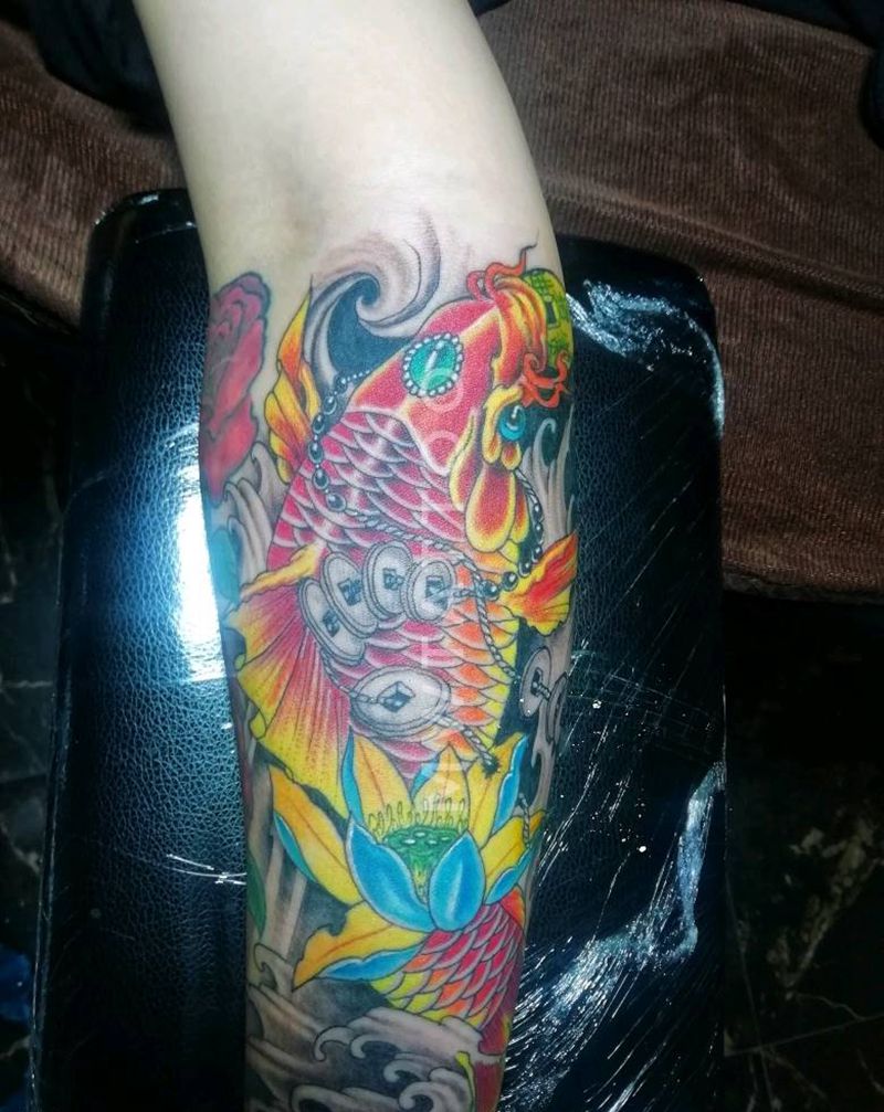 当前位置: 首页 >山东省菏泽市纹身店-菏泽墨舞刺青工作室纹身图案>招财鱼纹身图片_手臂新传统老传统纹身图案