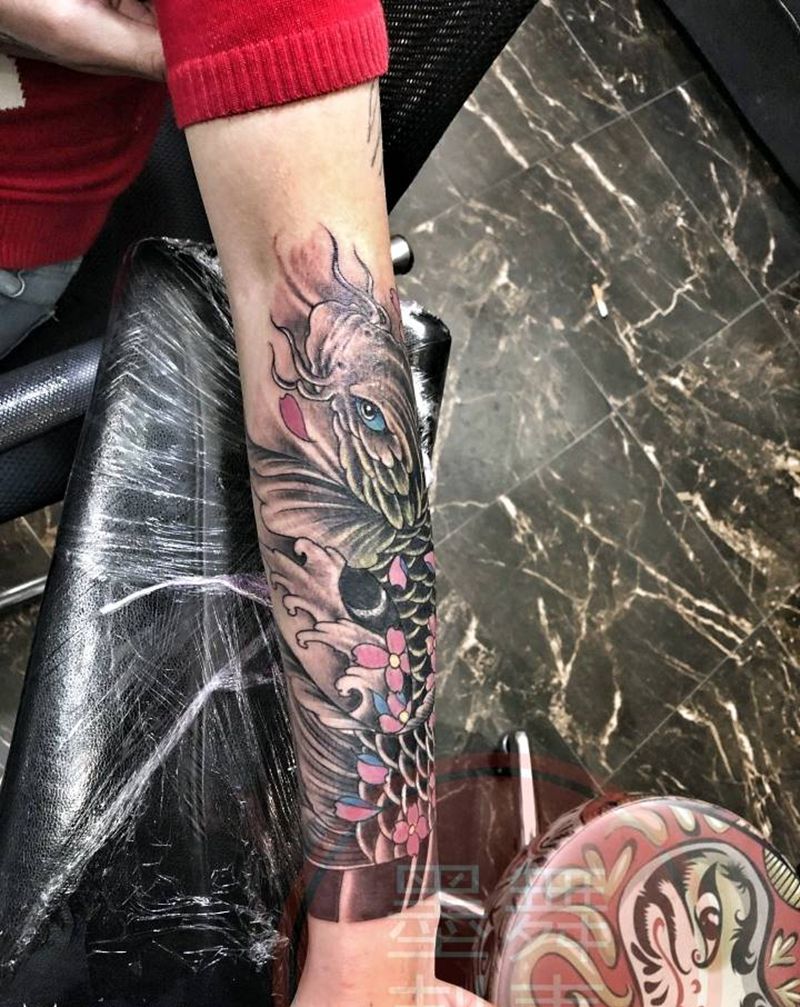 当前位置: 首页 >山东省菏泽市纹身店-菏泽墨舞刺青工作室纹身图案>鲫鱼纹身图片_手臂新传统遮盖纹身图案