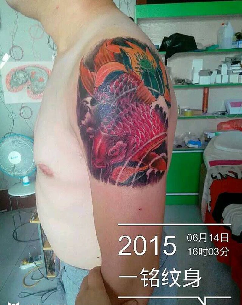 当前位置: 首页 >山东省滨州市纹身店-滨州惠民一铭纹身纹身图案>无疼彩色锦鲤遮盖纹身图片_肩部传统动物成品纹身图案