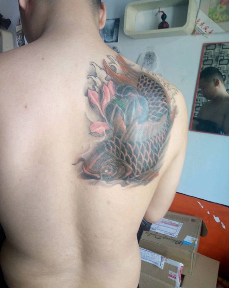 遮盖作品锦鲤荷花纹身图片_背部传统动物成品纹身图案
