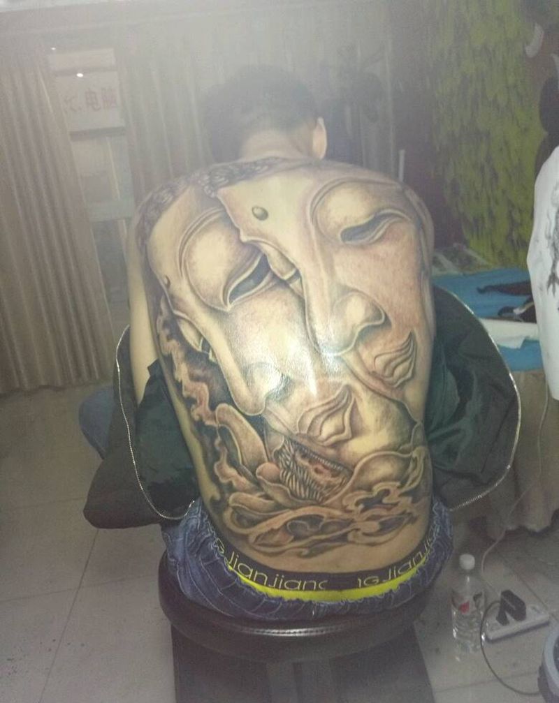 当前位置: 首页 >山东省滨州市纹身店-滨州惠民一铭纹身纹身图案>双面佛头纹身图片_背部传统人物鬼神宗教成品纹身图案