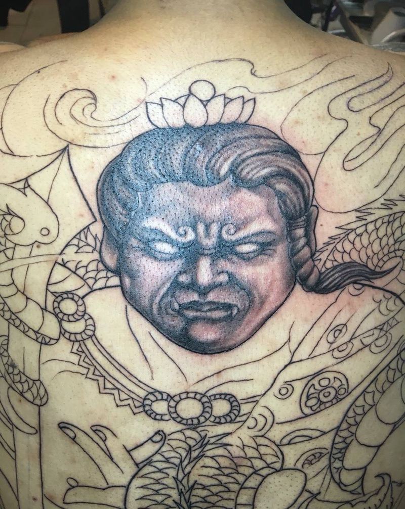满背不动明王咯哈纹身图片_成品背部传统人物原创纹身图案