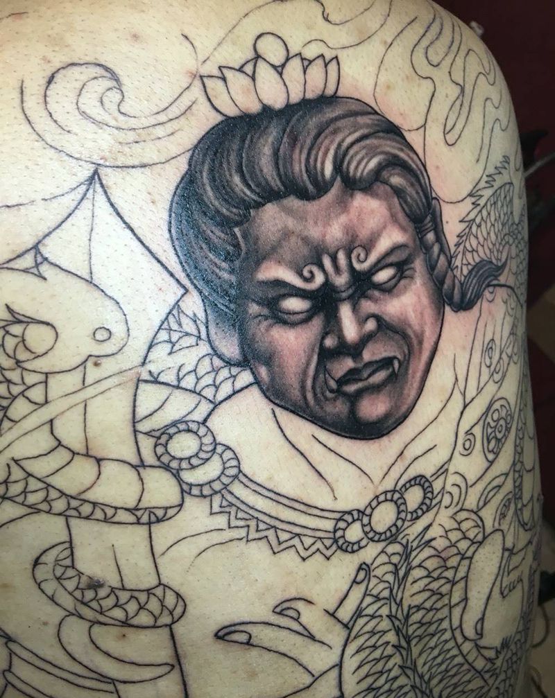 满背不动明王咯哈纹身图片_成品背部传统人物原创纹身图案