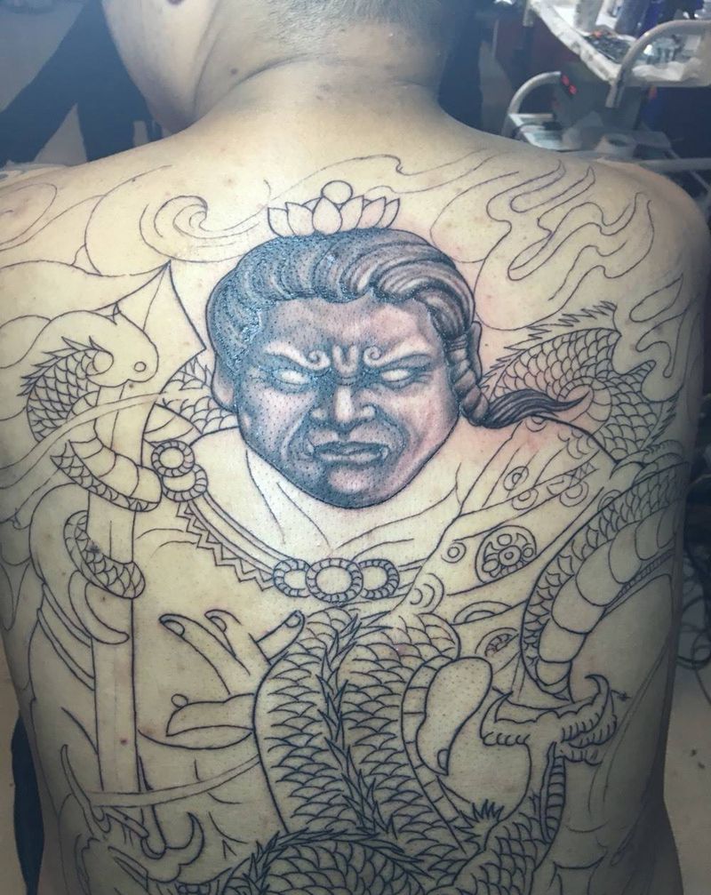 满背不动明王咯哈纹身图片_成品背部传统人物原创纹身图案