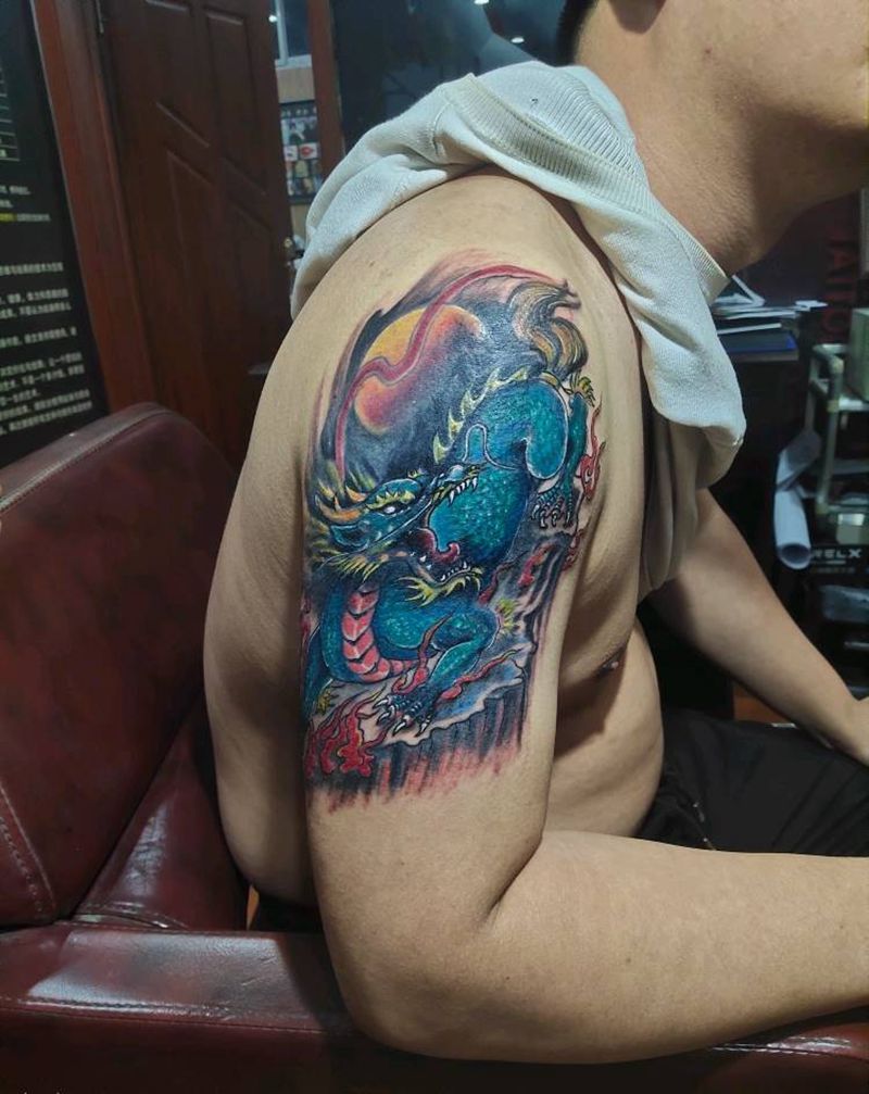 • T网红王老大花腿龙纹身图片_腿部新传统纹身图案
