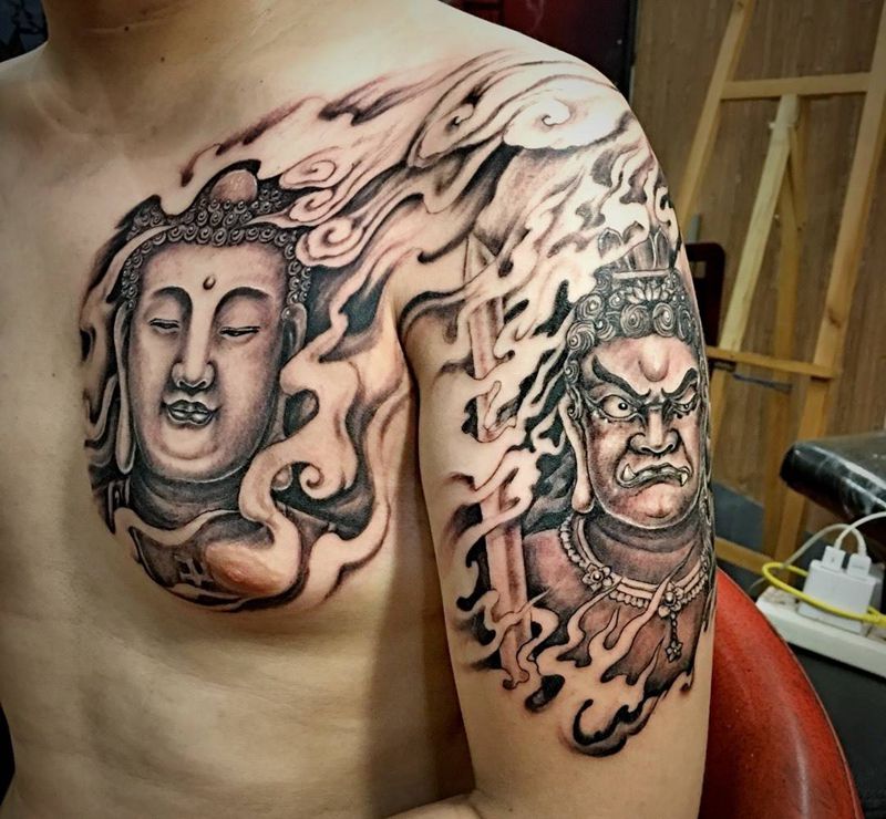 当前位置: 首页 >山东省聊城市纹身店-伍缔堂刺青馆阿涛纹身图案>半胛前胸本店设计手稿纹身图片