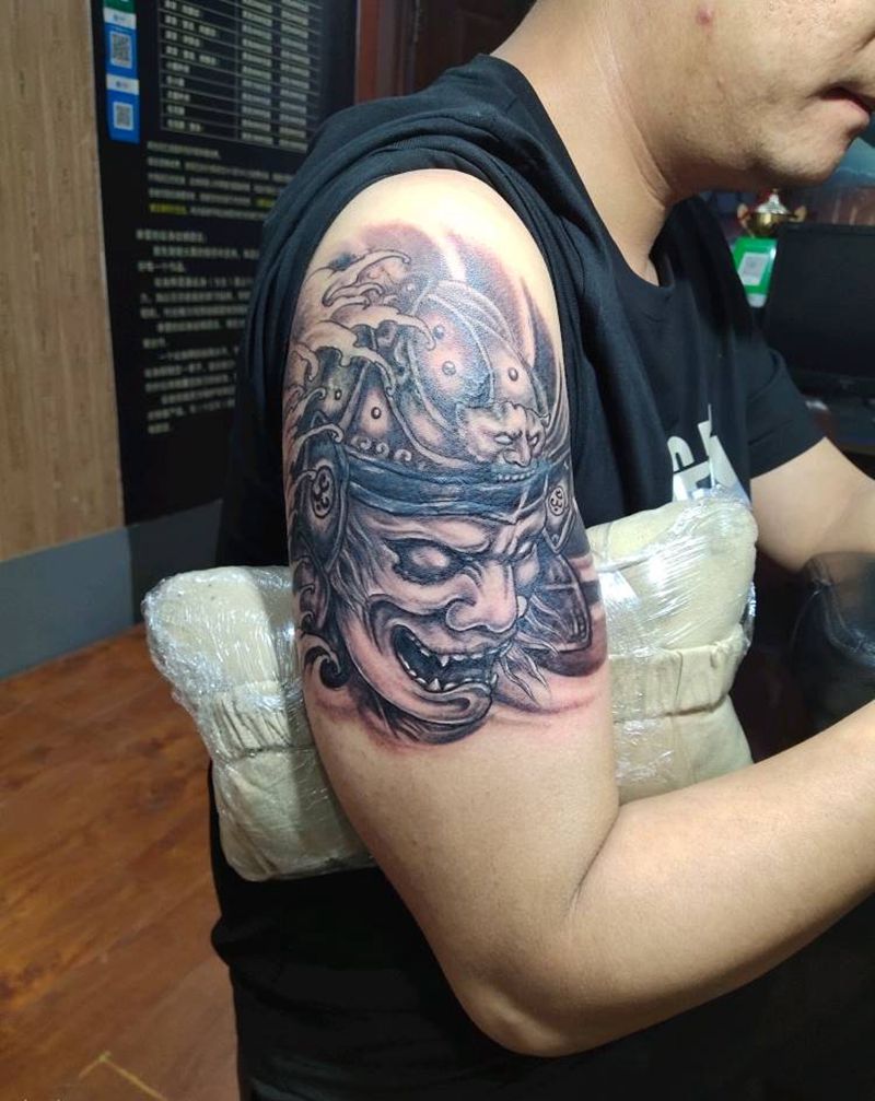 当前位置: 首页 >山东省聊城市纹身店-伍缔堂刺青馆阿涛纹身图案>上臂般若遮盖图腾文字纹身图片_手臂新传统纹身图案