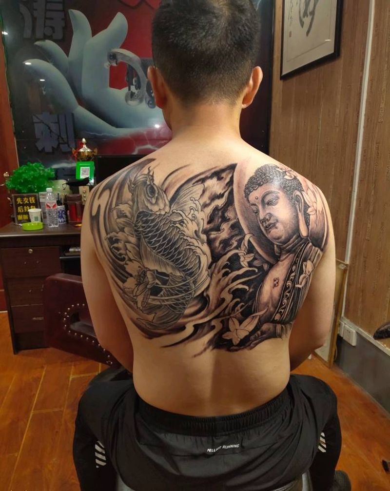 当前位置: 首页 >山东省聊城市纹身店-伍缔堂刺青馆阿涛纹身图案>半背聆听纹身图片_背部新传统纹身图案