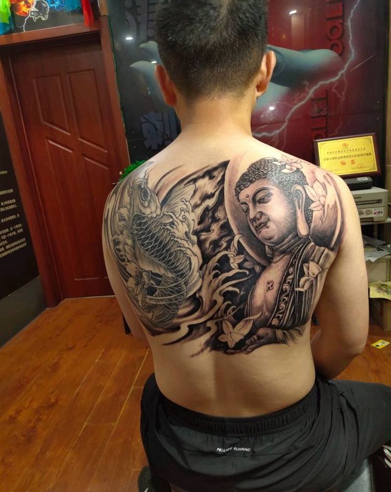 当前位置: 首页 >山东省聊城市纹身店-伍缔堂刺青馆阿涛纹身图案>半背聆听纹身图片_背部新传统纹身图案