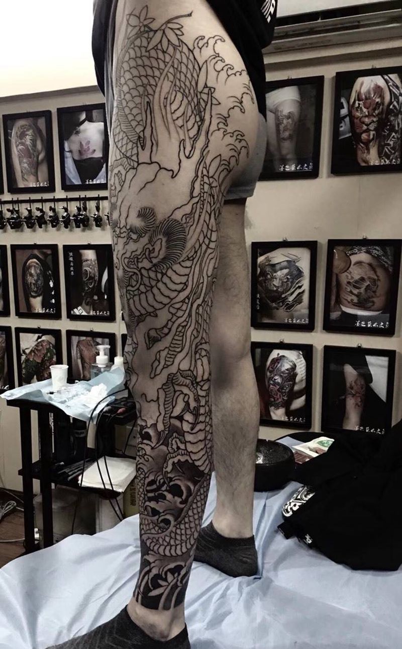 • T网红王老大花腿龙纹身图片_腿部新传统纹身图案