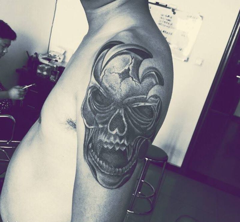 当前位置: 首页 >河南省郑州市纹身店-大孟刺青工作室纹身图案>骷髅头遮盖图腾纹身图片_成品手臂欧美原创鬼神纹身图案
